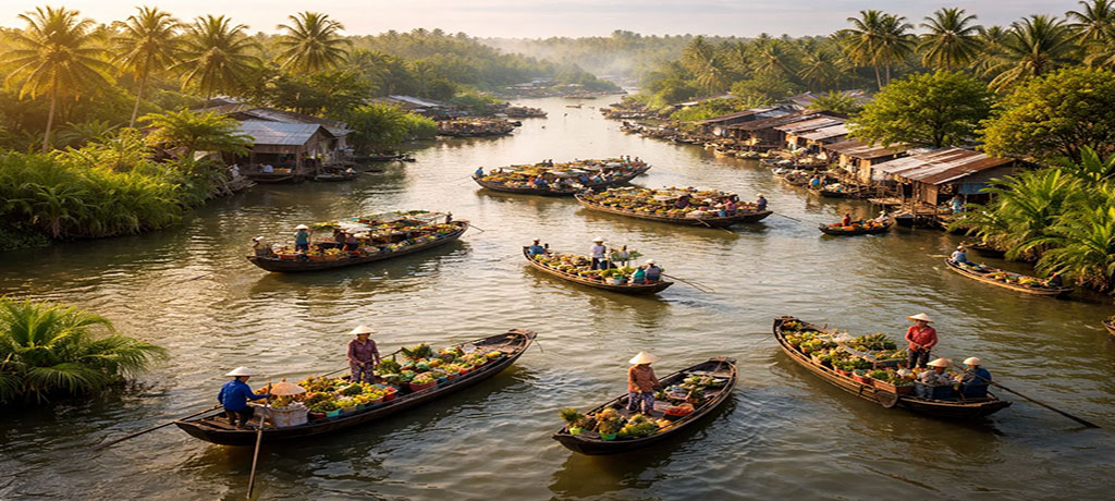 Giornata a Ben Tre: barca tra i canali fiancheggiati da palme di cocco, visita a piccola produzione locale, trasferimenti in xe lôi o tuk-tuk tra i villaggi, sampan nei canali stretti. Pranzo semplice in ristorante-giardino (a proprie spese per mantenere solo colazione, o includibile su richiesta). Pernottamento a Saigon.